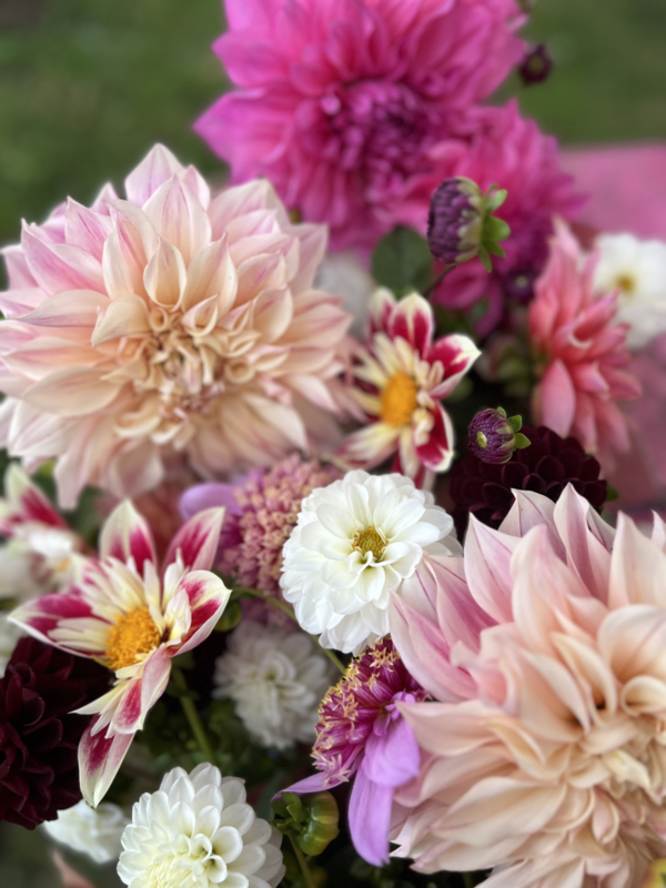 De grote bloemen tonen een verfijnd kleurverloop van crème naar blush en perzik, met subtiele strepen die elke bloem uniek maken. Deze variëteit is geliefd bij bloemstylisten en pluktuinliefhebbers vanwege haar elegante, serene uitstraling.