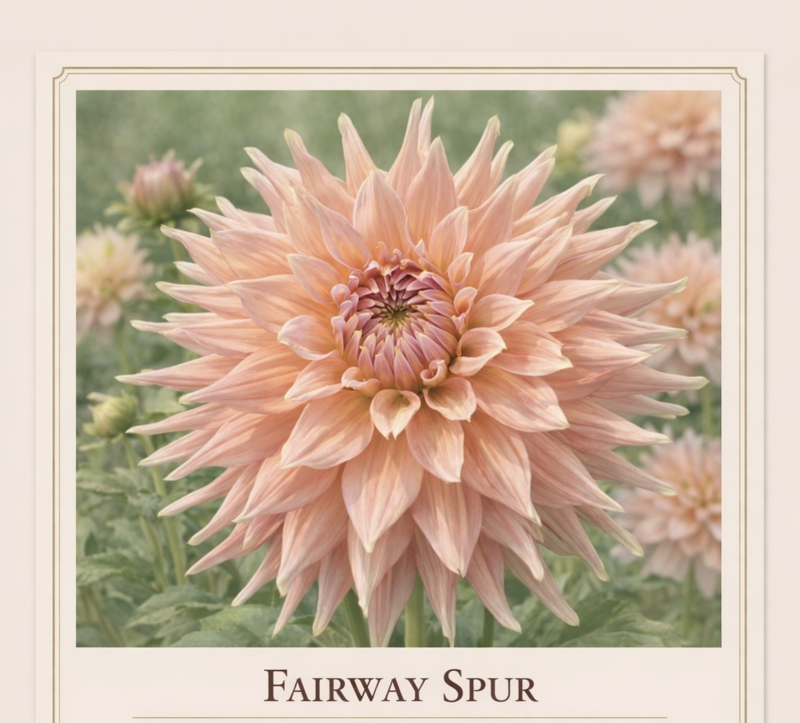 FAIRWAY SPURDahlia Fairway Spur is een elegante cactusdahlia met lange, spitse bloemblaadjes en een zacht zalmroze kleur. De luchtige vorm en speelse uitstraling maken haar een echte blikvanger in de border én in boeketten.