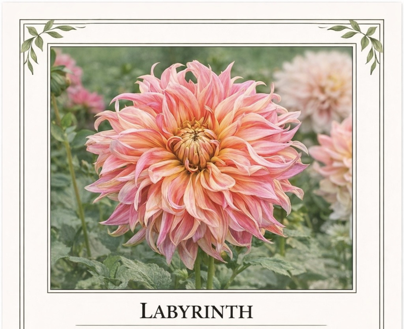 LABYRINTH-dahliaknolBestel Labyrinth dahlia knollen. Unieke gedraaide bloemblaadjes, warme zalmroze tinten en rijkbloeiend. Een echte blikvanger voor creatieve tuinen.